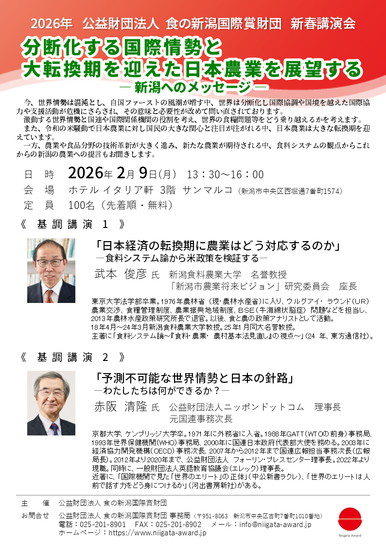 今、世界情勢は混沌とし、自国ファーストの風潮が増す中、世界は分断化し国際協調や国境を越えた国際協力や支援活動が危機にさらされ、その意味と必要性が改めて問い直されております。 激動する世界情勢と国連や国際関係機関の役割を考え、世界の食糧問題等をどう乗り越えるかを考えます。 また、令和の米騒動で日本農業に対し国民の大きな関心と注目が注がれる中、日本農業は大きな転換期を迎えています。 一方、農業や食品分野の技術革新が大きく進み、新たな農業が期待される中、食料システムの観点からこれからの新潟の農業への提言もお聞きします。